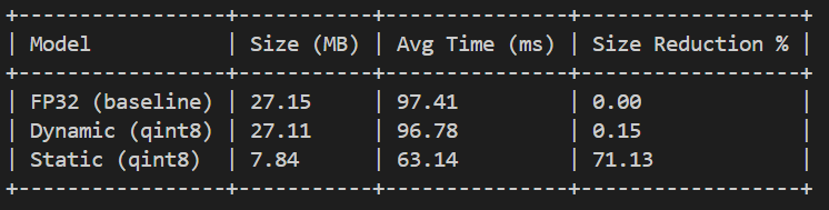 Dynamic quantization showed almost no improvement, which I think is because