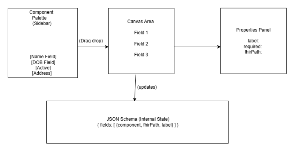 For the preliminary approach, it may help to keep the prototype focused on a basic drag-and-drop canvas, a small starter palette of components, a simple config/properties panel, and binding to one FHIR resource like you have done.